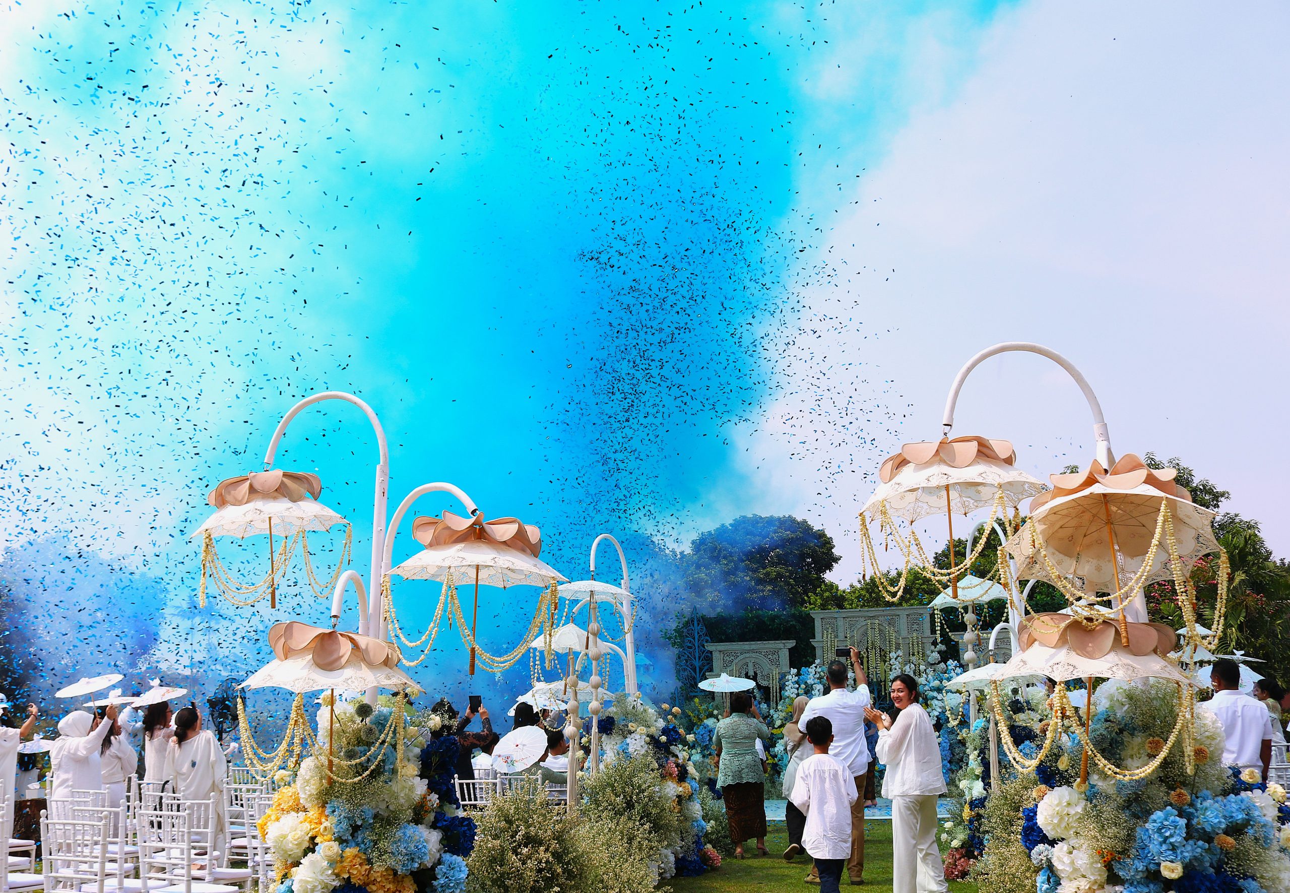 Dekorasi acara gender reveal pun sangat elegan yang didominasi bunga warna putih dan biru. Dan terlihat keluarga besar, kerabat, sahabat serta tamu undangan sangat antusias menunggu momen Putra dan Andie mengumumkan jenis kelamin anak pertama mereka.