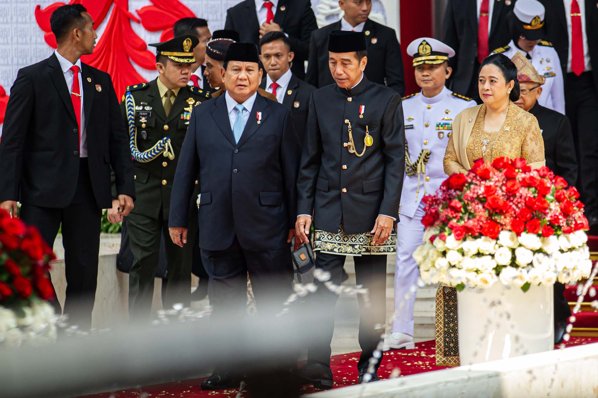 Presiden Joko Widodo (ketiga kanan) bersama Menteri Pertahanan yang juga Presiden Terpilih Prabowo Subianto (ketiga kiri) dan Ketua DPR Puan Maharani (kanan) berjalan usai mengikuti Sidang Tahunan MPR dan Sidang Bersama DPR-DPD Tahun 2024 di Gedung Nusant