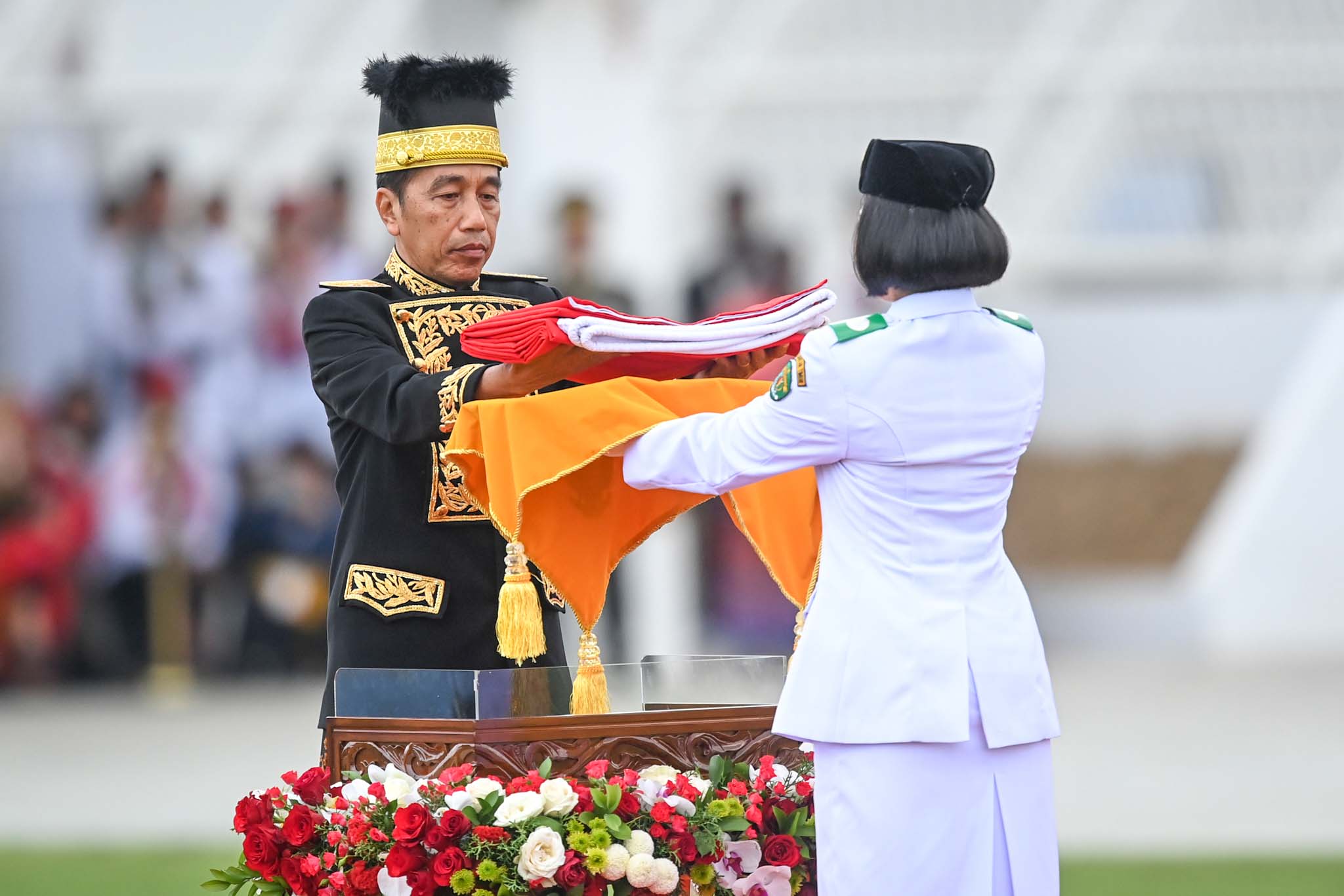 Presiden Joko Widodo (kiri) menyerahkan duplikat Bendera Pusaka kepada anggota Paskibraka 2024 asal Kalimantan Timur Livenia Evelyn Kurniawan (kanan) untuk dikibarkan dalam upacara Peringatan Detik-detik Proklamasi Kemerdekaan Republik Indonesia (RI) di l