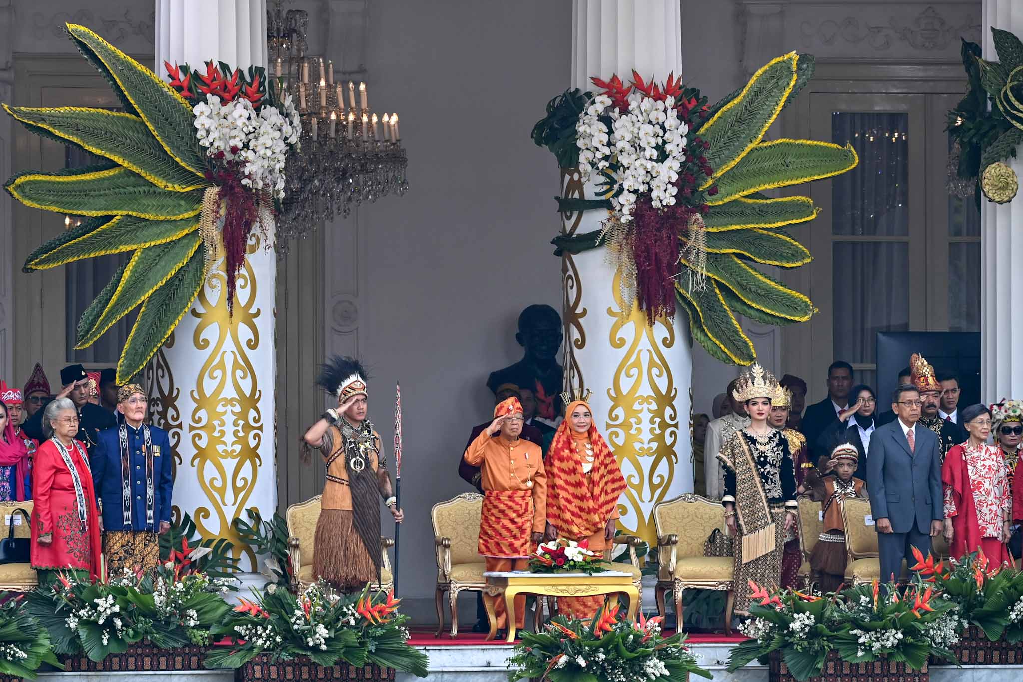 Presiden Joko Widodo (keempat kanan) didampingi Ibu Iriana Joko Widodo (kanan) didampingi Menhan  Prabowo Subianto (keempat kiri) memberikan penghormatan kepada peserta upacara Peringatan Detik-detik Proklamasi Kemerdekaan Republik Indonesia (RI) di lapan